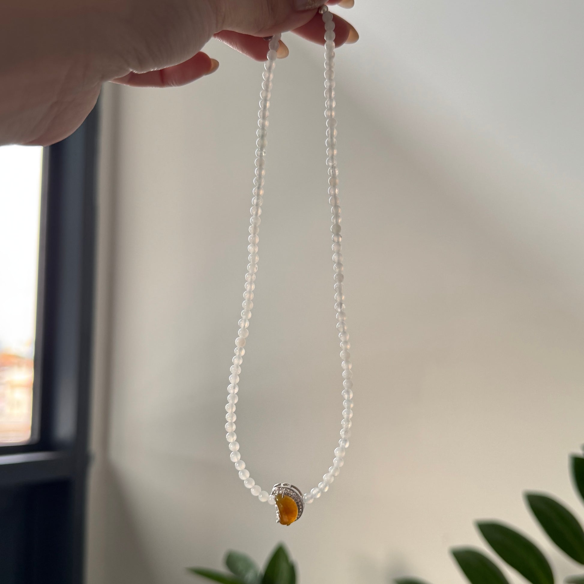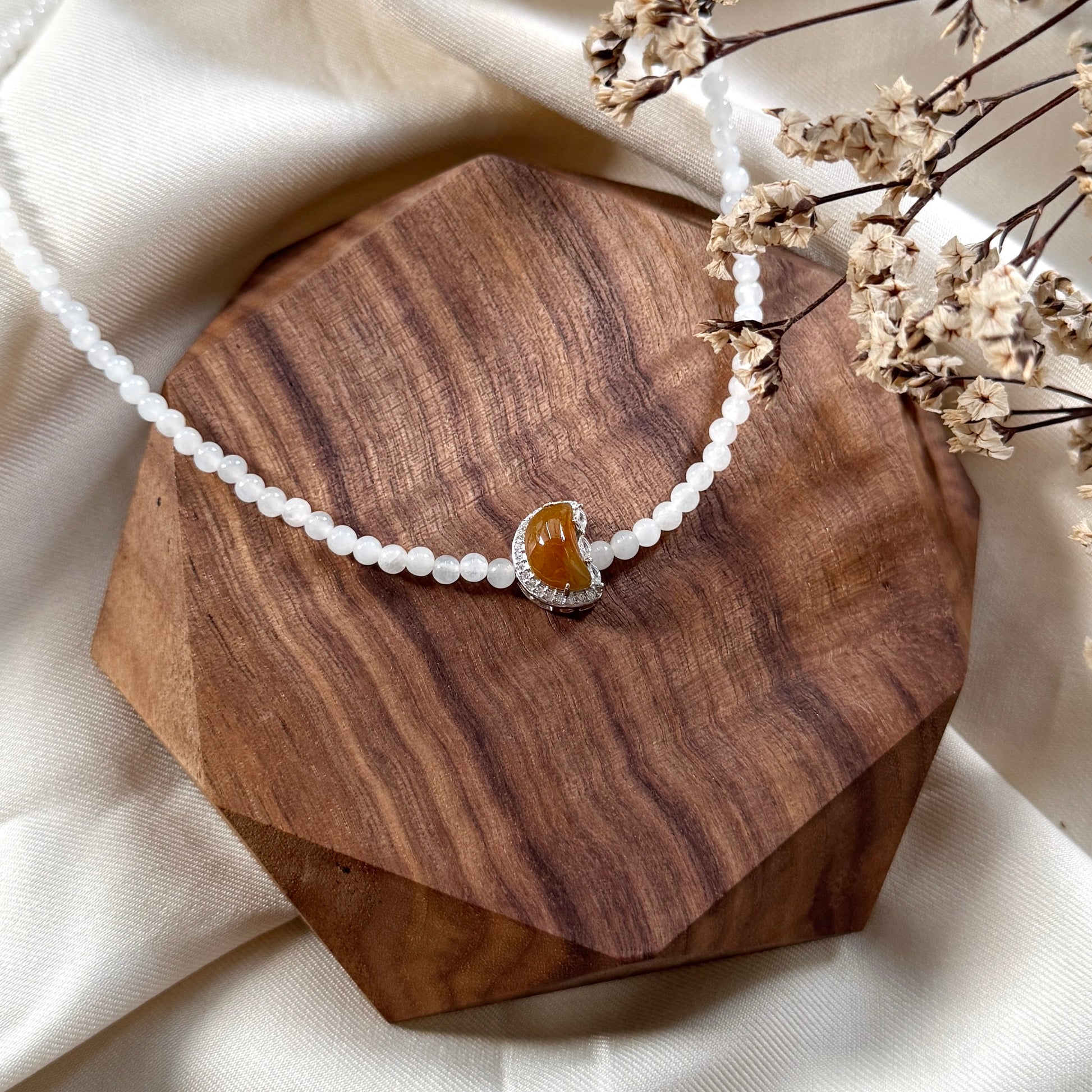 A delicate strand of luminous white jadeite beads, centred with a crescent-shaped amber jadeite charm embraced by a halo of pavé-set stones. The Moonlight Necklace speaks of gentle power — a reminder that every path is guided, every moment woven by unseen threads.