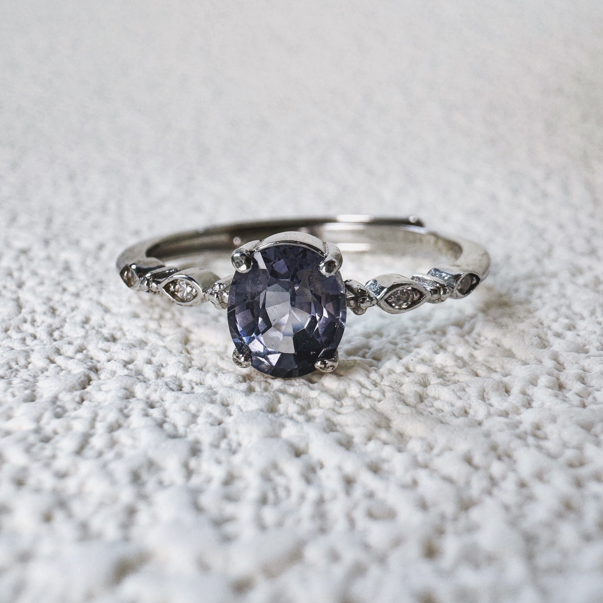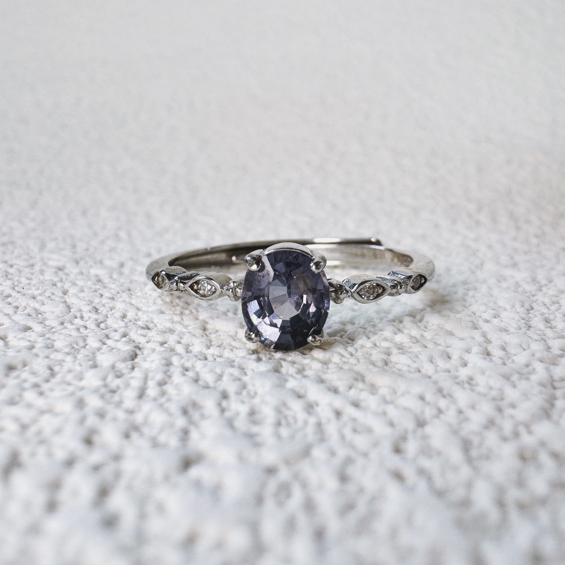 The Mystara Spinel Ring is a stunning blend of elegance and mystery. At its heart lies an alluring oval-cut spinel, radiating deep shades of midnight blue and violet, reminiscent of twilight skies. The gemstone is set in a polished sterling silver band, adorned with delicate accent stones that add a touch of sparkle and sophistication to the design.