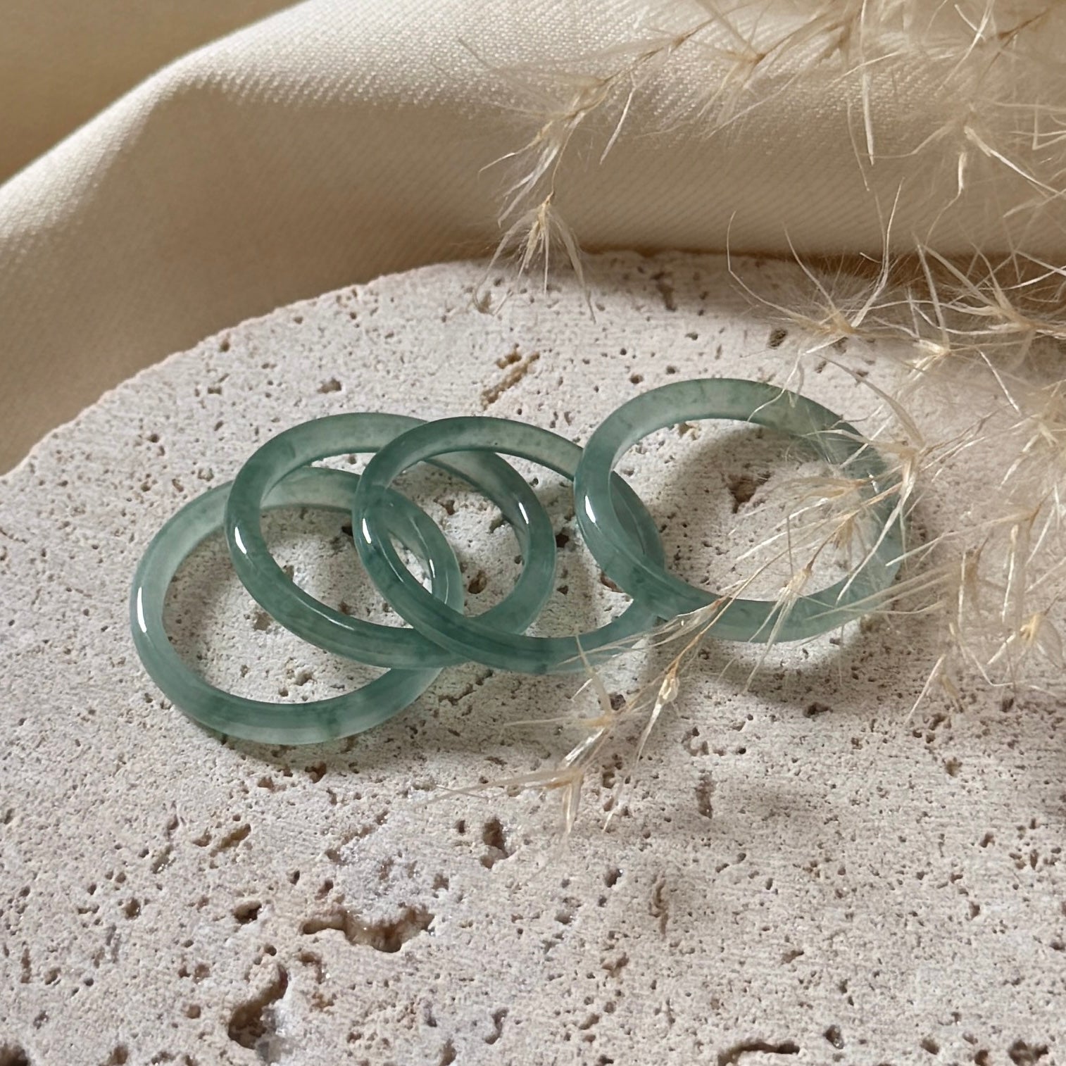 Slim Guatemalan jadeite rings in a soft sea-teal tone with gentle clouding and natural texture. Their lightweight profile and high polish give them a breezy elegance, perfect for everyday stacking or a quiet standalone statement. Nerida evokes the clarity of cool waters and coastal skies.