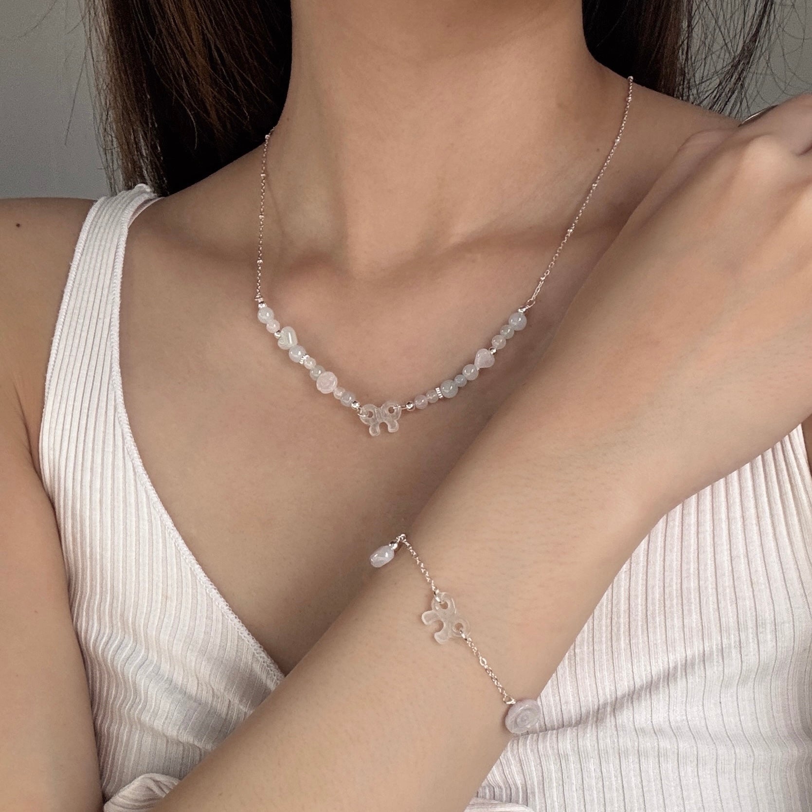 Playful yet elegant, the Noémie Jadeite Necklace captures the spirit of lighthearted charm. This necklace showcases a delicate arrangement of soft-hued jadeite beads, each radiating subtle elegance. At its heart, a whimsical bow charm adds a touch of joy and freedom to the piece. Crafted with 925 silver, the fine chain complements the airy design, making it perfect for layering or wearing alone as a dainty statement. Noémie invites you to embrace simplicity with a hint of enchantment, perfect for both everyday wear and special occasions.