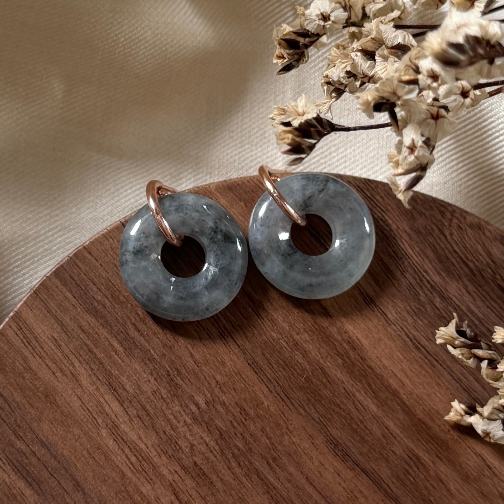 Smooth Wuji jadeite doughnuts in cool, smoky grey — paired with warm rose gold hoops for a soft contrast. The Noiré Earrings are quietly striking, crafted for subtle elegance and everyday ease.