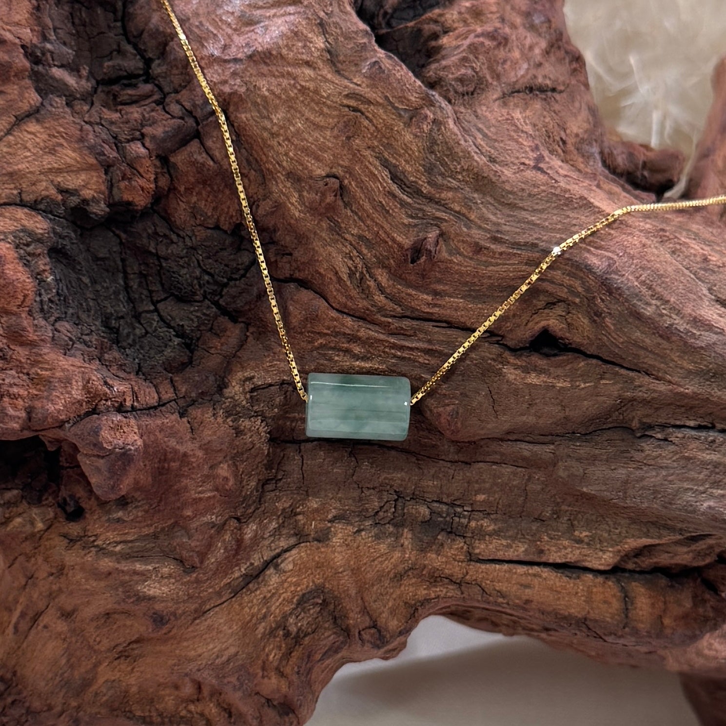 A jadeite barrel pendant suspended on a silver plated 18k gold chain. The Olea Necklace brings out jade’s natural green hues in a sleek, cylindrical form, combining timeless elegance with modern simplicity.