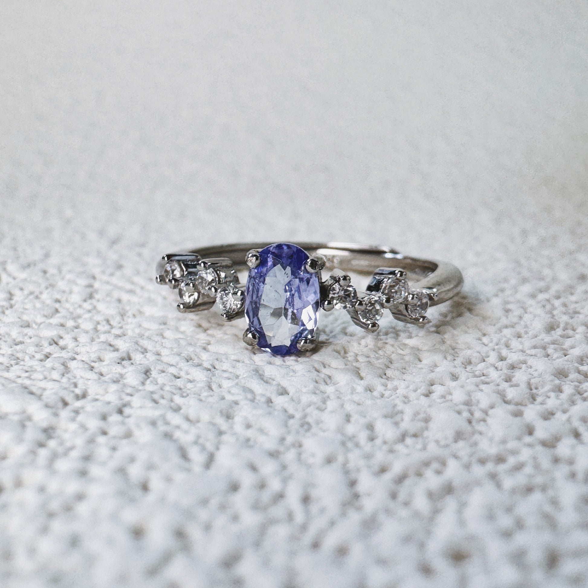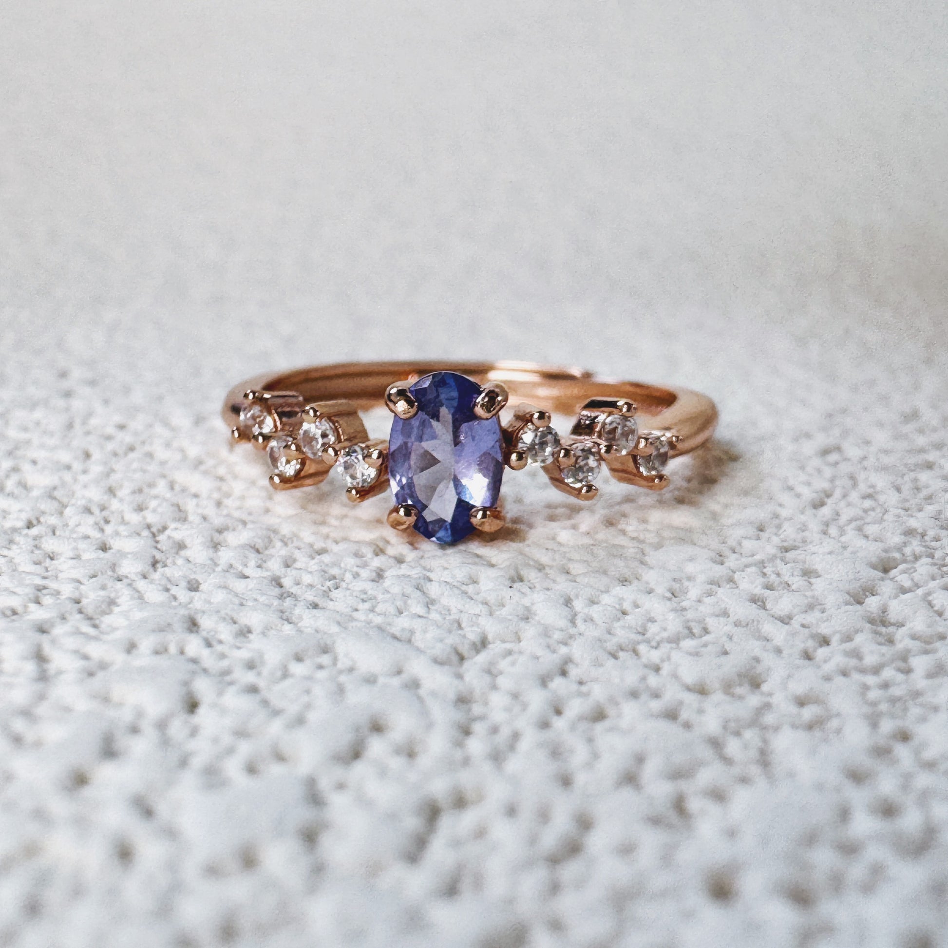 The Petal Tanzanite Ring captures the delicate beauty of nature with its exquisite oval-cut tanzanite gemstone, radiating a mesmerising lavender-blue hue. Nestled among sparkling accent stones that mimic a cascading floral motif, this ring is available in luxurious rose gold or sterling silver finishes. Perfect for adding a touch of elegance and sophistication to any look, this is both a modern statement and a timeless treasure. Ideal for special occasions or as a gift for someone extraordinary.