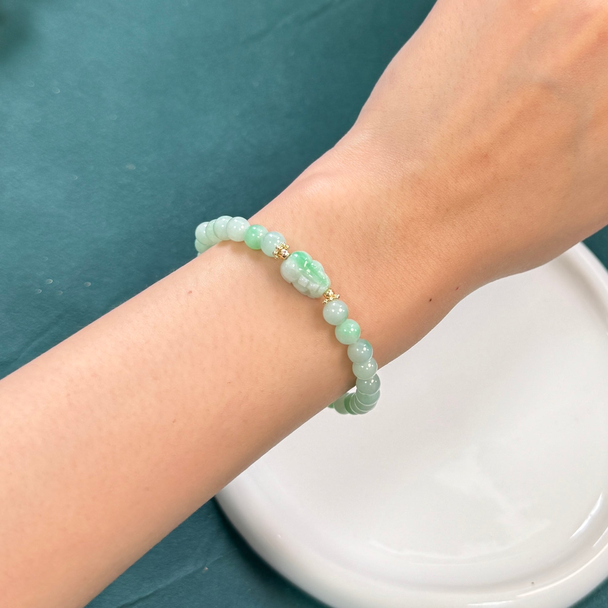 Fresh green jade beads with a Pixiu accent, designed to carry wealth symbolism subtly.