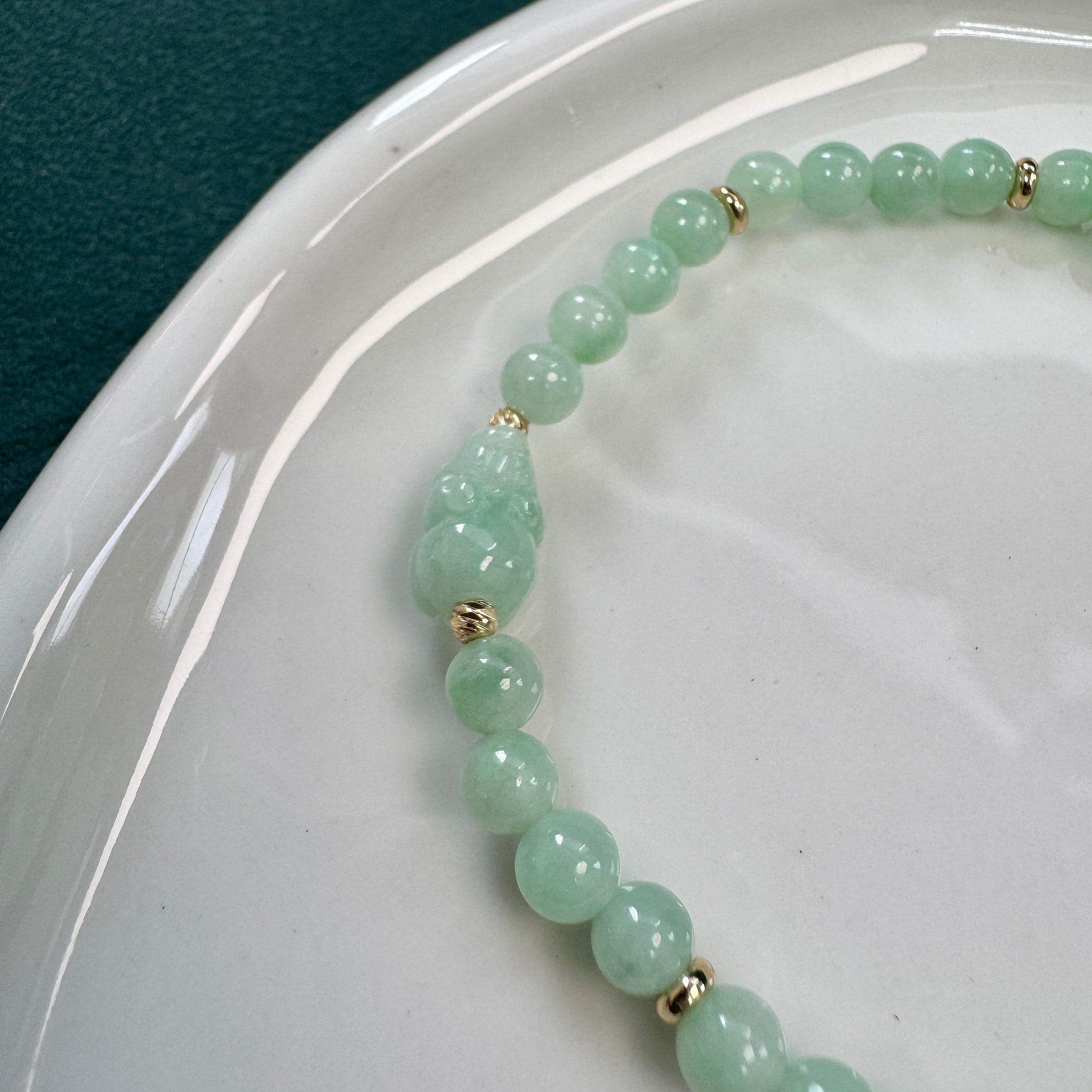Fresh green jade beads with a Pixiu accent, designed to carry wealth symbolism subtly.