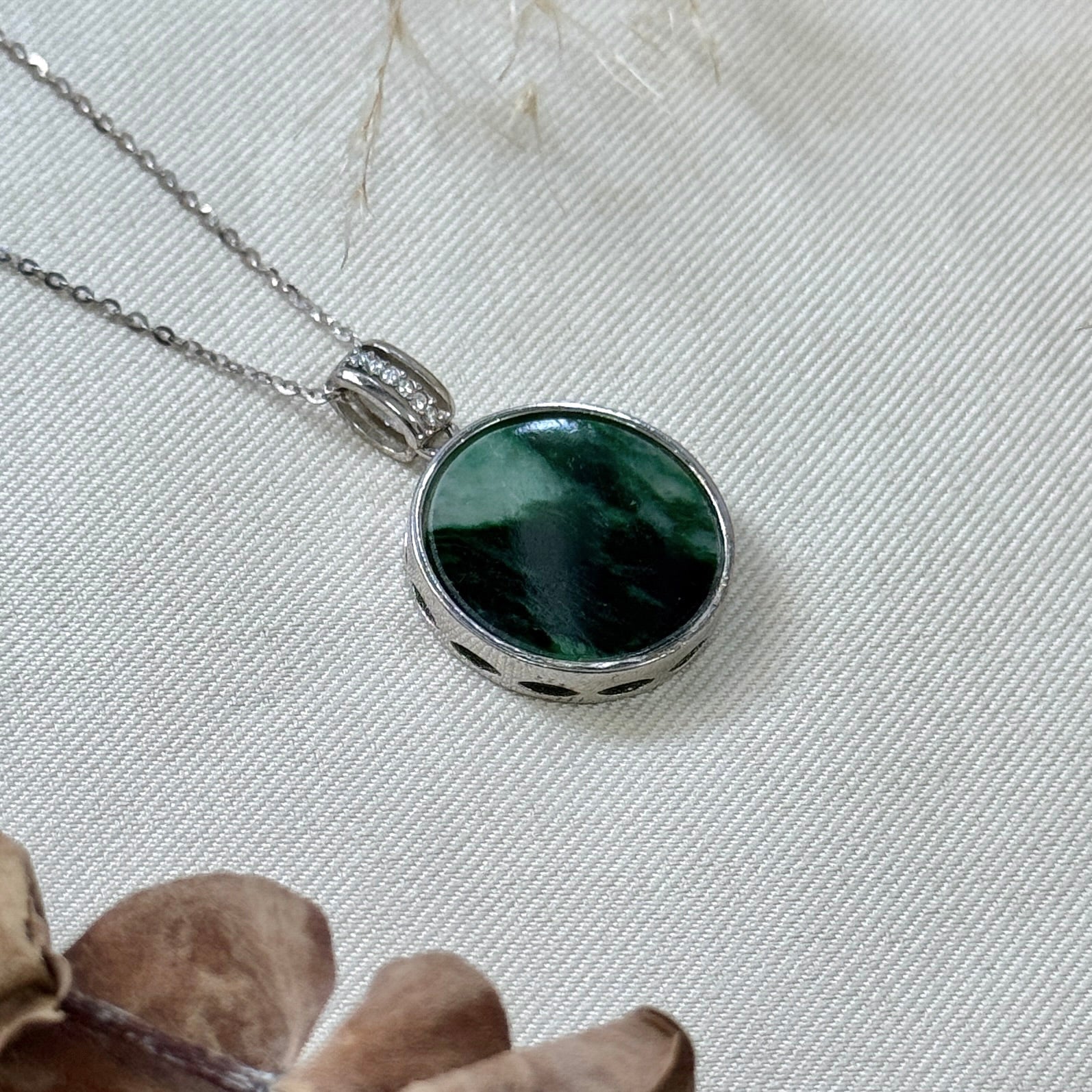 Deep green jadeite round pendant set in 925 silver with a zircon-accented bail - a symbol of peace, balance, and prosperity.