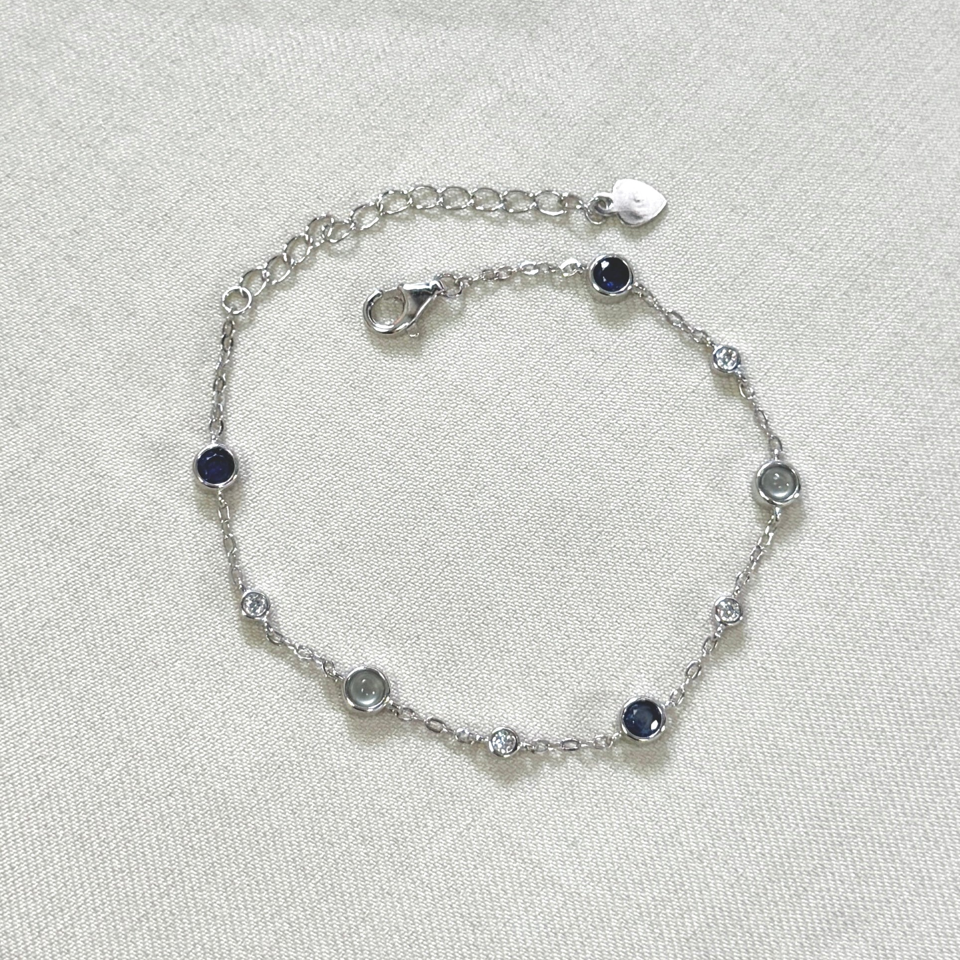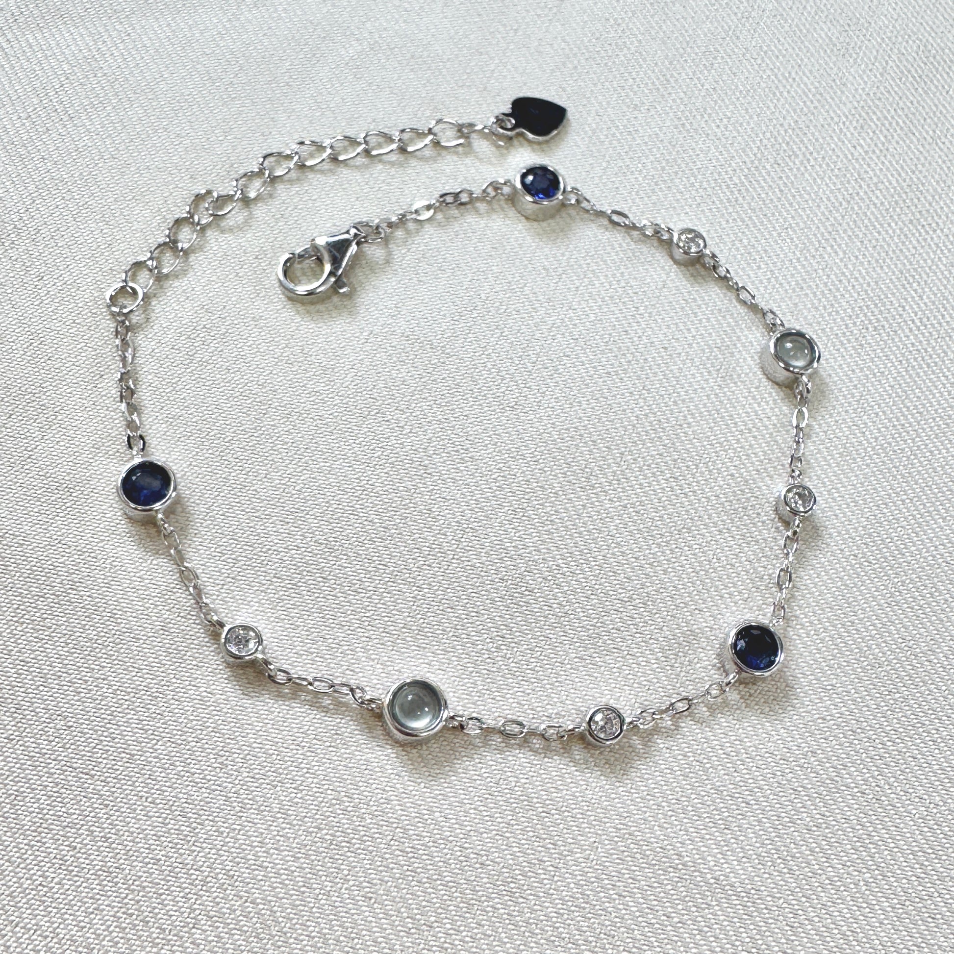 A delicate interplay of deep night and soft moonlight, the Selas Jadeite Bracelet is a celestial-inspired piece that captures the beauty of contrast. Featuring rich blue sapphires reminiscent of a starlit sky and luminous jadeite cabochons symbolizing tranquility, this bracelet is a balance of mystery and serenity. Dotted with sparkling cubic zirconia, it shimmers with every movement, adding a refined touch to any ensemble.