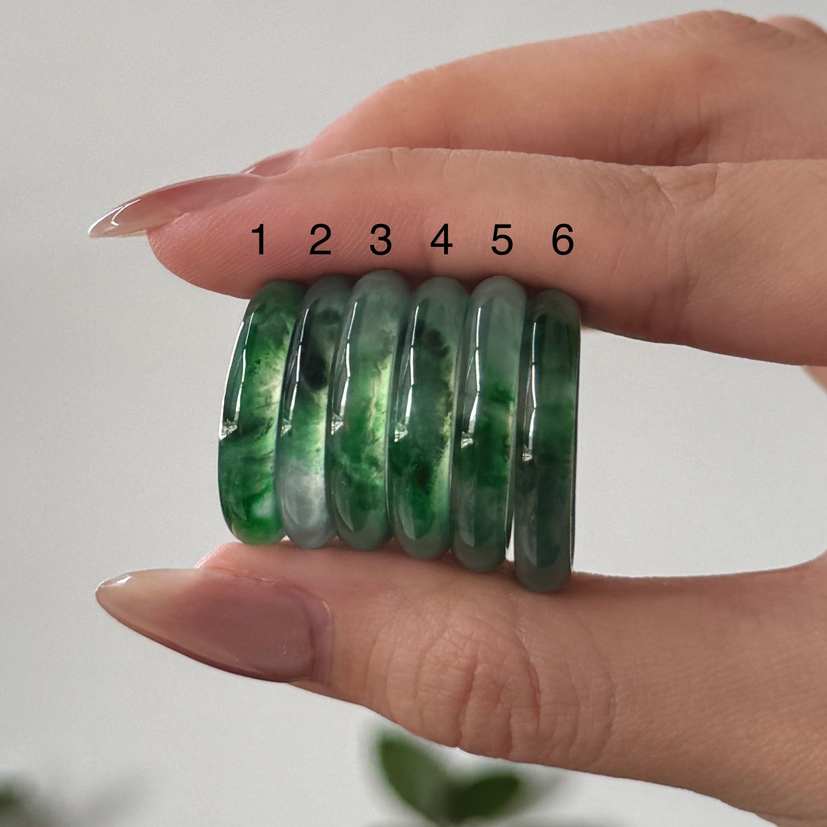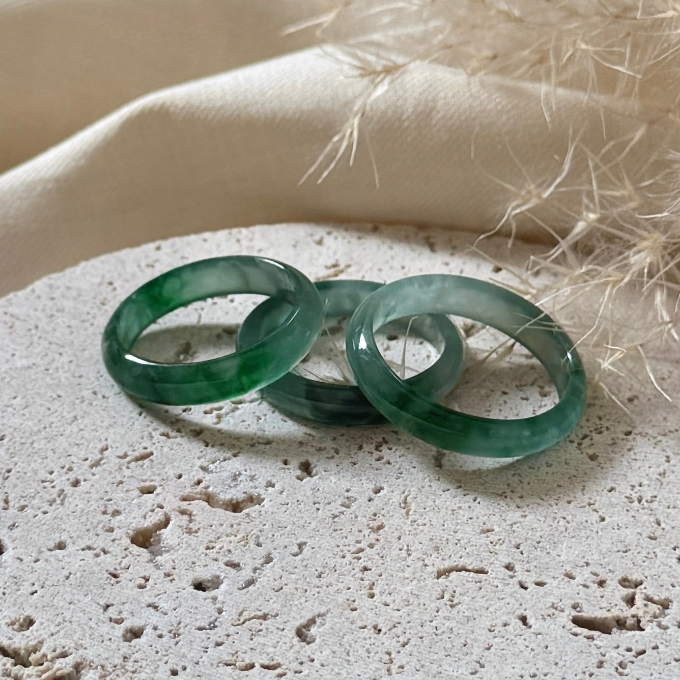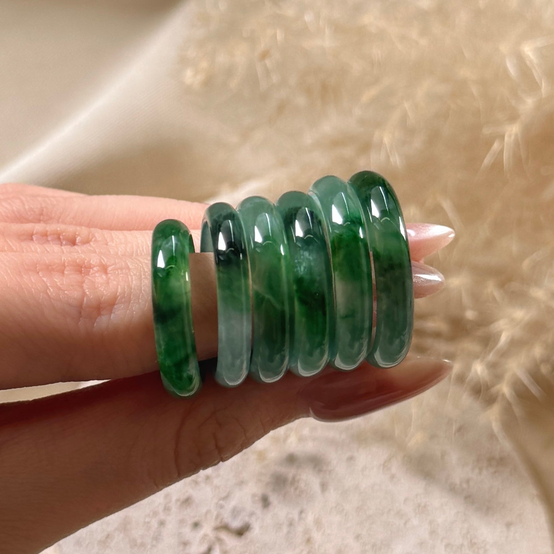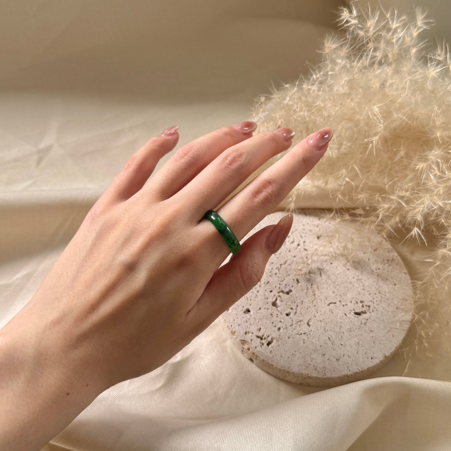 Carved from Guatemalan jadeite, Selva features a bold forest-green tone with inky swirls and cloudy marbling unique to each piece. The high-domed silhouette is polished to a luminous shine, bringing out the organic depth of the stone. A striking statement ring with untamed, natural elegance.