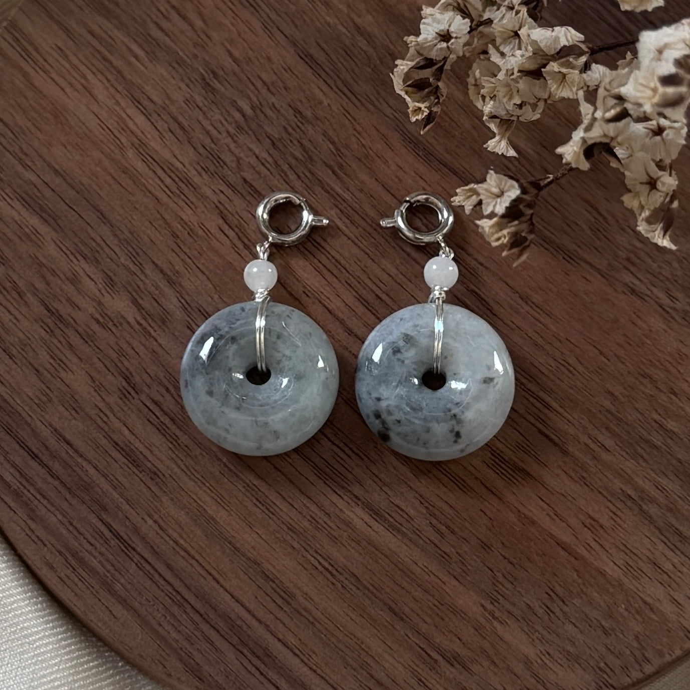 A soft grey jadeite doughnut with natural black silk inclusions, resembling scattered sesame seeds. Minimal and versatile, this charm adds a quiet touch of texture and depth to any look.
