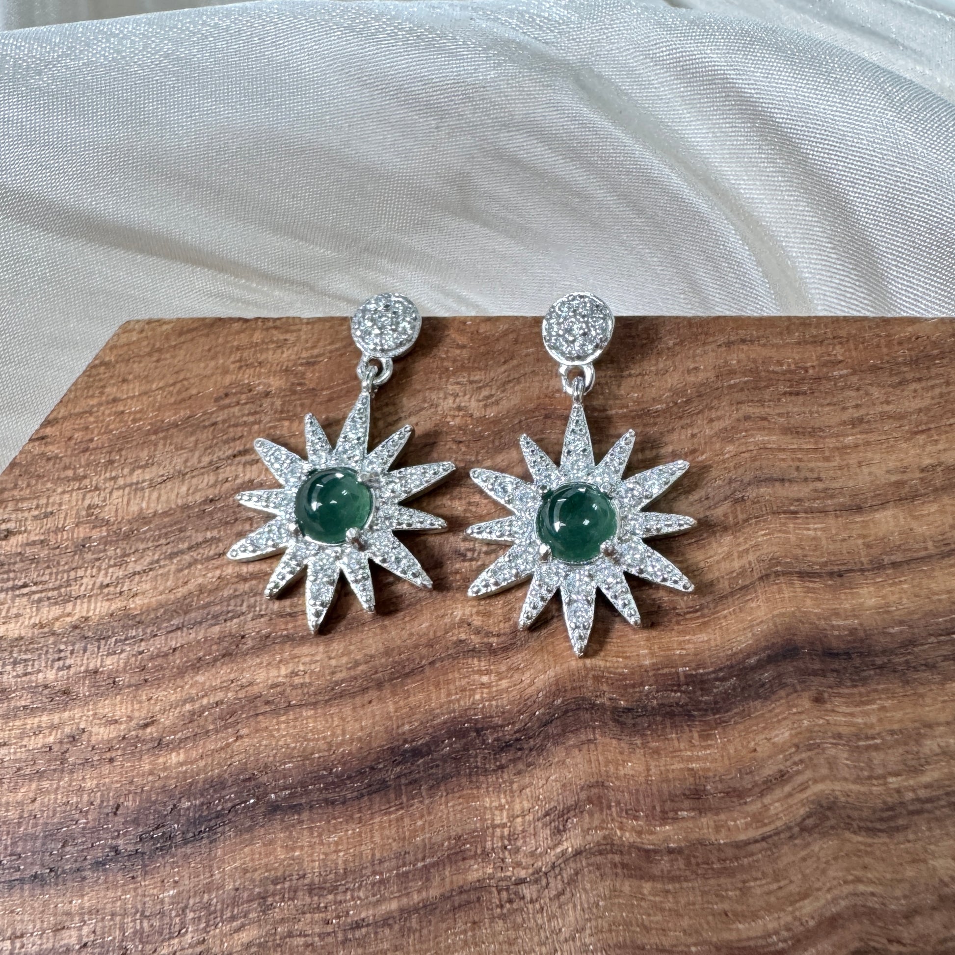 Radiating with brilliance, these starburst earrings feature luminous jadeite cabochons at their centre, surrounded by a halo of sparkling accents that form a striking sun-inspired silhouette. The elongated rays catch the light beautifully, creating a bold yet elegant statement.
