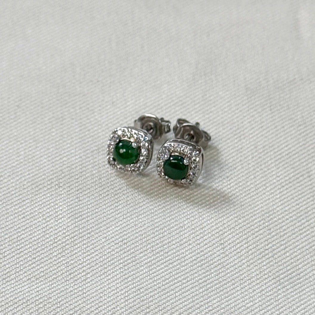 Dark green jadeite square halo studs - blackened depth with a green glow in light.