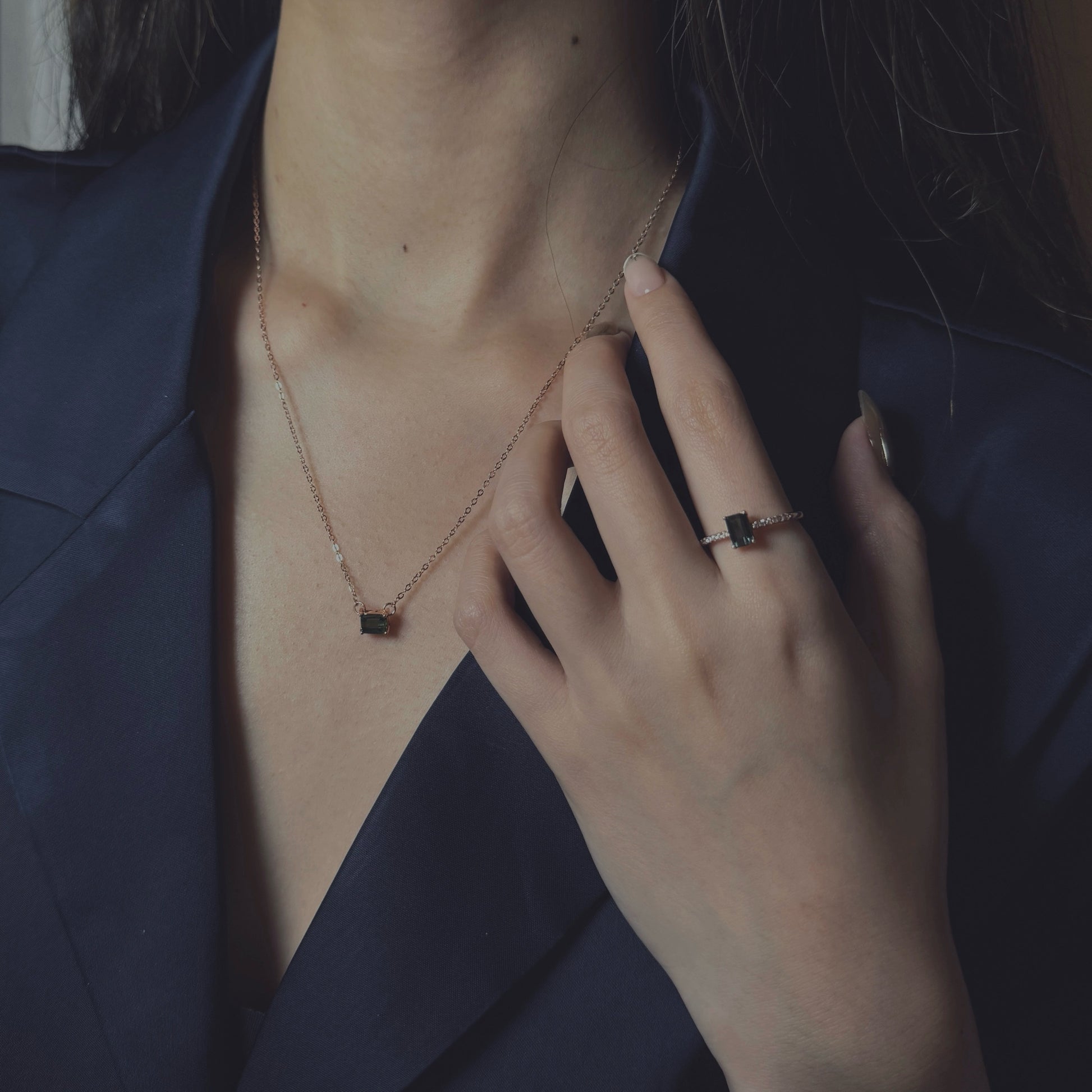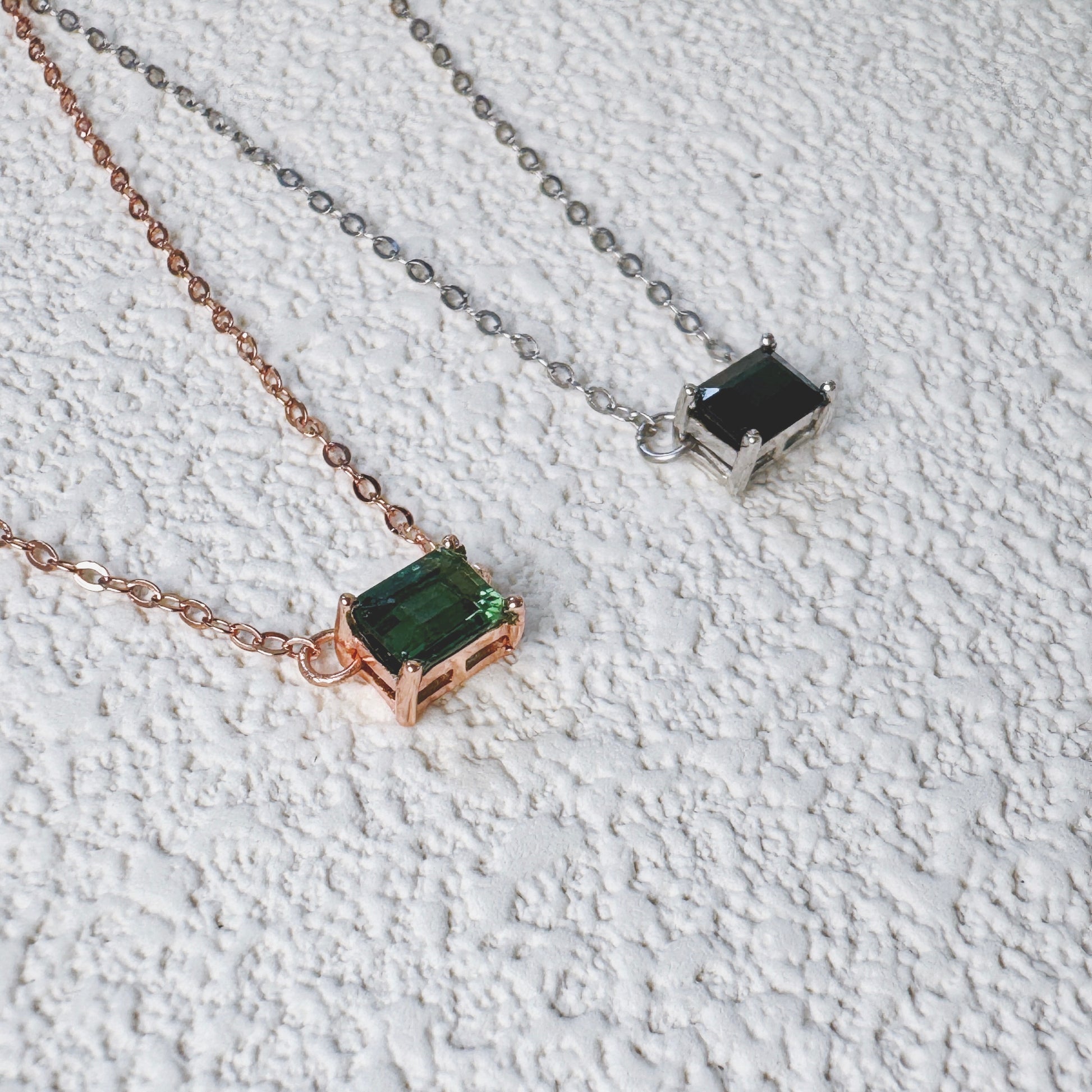 The Terra Emerald-Cut Tourmaline Necklace is a captivating piece that draws inspiration from the natural beauty of the earth. Featuring a striking emerald-cut tourmaline gemstone, this pendant comes in two stunning options: a rich teal tourmaline set in warm rose gold, and a deep, mysterious dark blue tourmaline set in sleek sterling silver. Each gemstone's elegant cut allows light to dance across its facets, creating a mesmerising play of colour and depth.