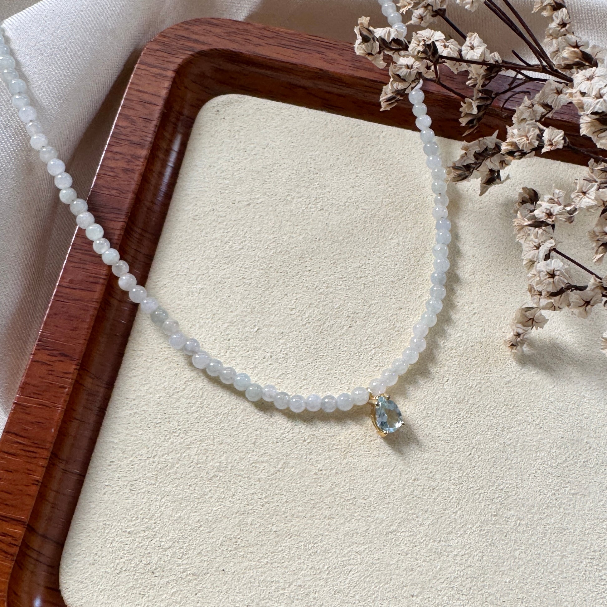 Graceful and understated, this necklace pairs luminous icy jadeite beads with a brilliant sky blue topaz drop, set in gold. The gentle clarity of the topaz evokes calm and new beginnings, while the smooth jadeite beads bring balance and softness. A timeless piece made for light-filled days.