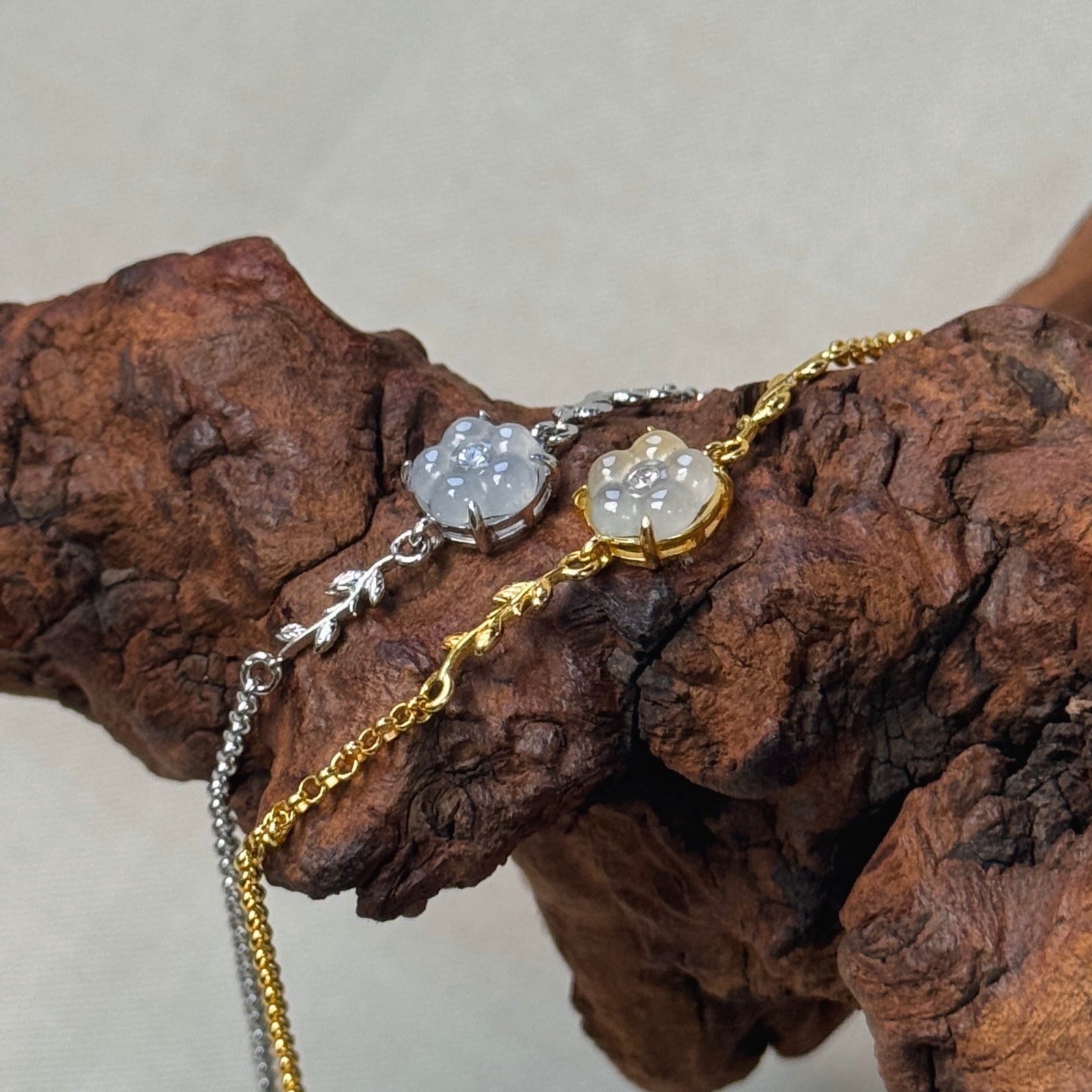 Ume is a softly carved plum blossom, crafted from natural Grade A jadeite with a gentle five-petal silhouette.