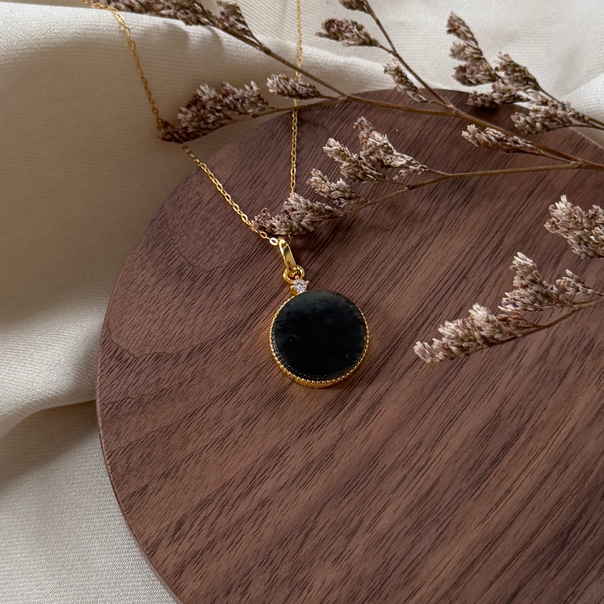 This wuji necklace features a round, high-polish black jadeite disc framed in a detailed gold-toned bezel setting. Suspended from a fine chain and topped with a petite clear accent stone, this piece is bold yet refined — a quiet statement of strength and elegance.